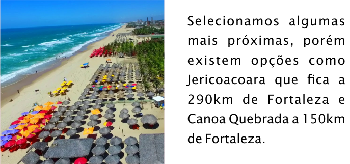 Praia do Futuro Praia e também bairro na área leste de Fortaleza, capital do estado do Ceará. É considerada uma das mais conhecidas praias do Nordeste. Cumbuco É uma pequena vila de pescadores situada a cerca de 25 quilômetros a noroeste da cidade de Fortaleza. Considerada o Havaí dos praticantes de Kite Surf entre outros esportes radicais. Porto das Dunas São 10 Km de praia cercados por grandes dunas muito brancas. A Praia Porto das Dunas é o lugar perfeito apara quem gosta de unir a beleza da natureza com o conforto urbano. A apenas 16Km de Fortaleza.