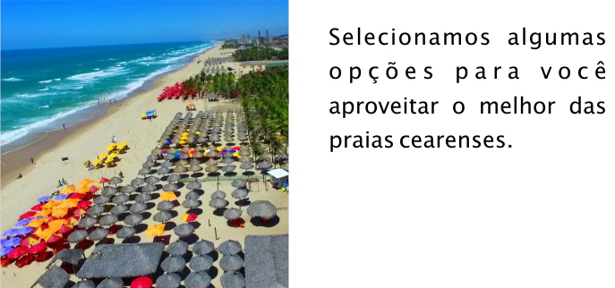 Praia do Futuro Praia e também bairro na área leste de Fortaleza, capital do estado do Ceará. É considerada uma das mais conhecidas praias do Nordeste. Cumbuco É uma pequena vila de pescadores situada a cerca de 25 quilômetros a noroeste da cidade de Fortaleza. Considerada o Havaí dos praticantes de Kite Surf entre outros esportes radicais. Porto das Dunas São 10 Km de praia cercados por grandes dunas muito brancas. A Praia Porto das Dunas é o lugar perfeito apara quem gosta de unir a beleza da natureza com o conforto urbano. A apenas 16Km de Fortaleza. Praia das Fontes Praia das Fontes está localizada na cidade de Beberibe no estado do Ceará. Seu cartão-postal é o labirinto, um conjunto de falésias coloridas - os tons vermelhos predominam - de onde se retiram areias de colorações variadas. Canoa Quebrada Localizada no litoral leste do Estado do Ceará, Distante 163 km de Fortaleza e 12 km da sede do município de Aracati, à qual pertence. A sua paisagem é caracterizada por dunas e falésias avermelhadas de até trinta metros acima do nível do mar. Jericoacoara É uma praia localizada no município de Jijoca de Jericoacoara, no estado do Ceará, no Brasil. Está localizada a 300 km a oeste da capital do estado, Fortaleza. Foi eleita em 1994 pelo jornal estadunidense The Washington Post uma das dez praias mais bonitas do planeta. Em 2014, foi eleita pelo Huffington Post a quarta melhor praia da Terra. É um dos locais mais frequentados por praticantes de windsurfe no país. A praia é parte integrante do Parque Nacional de Jericoacoara.